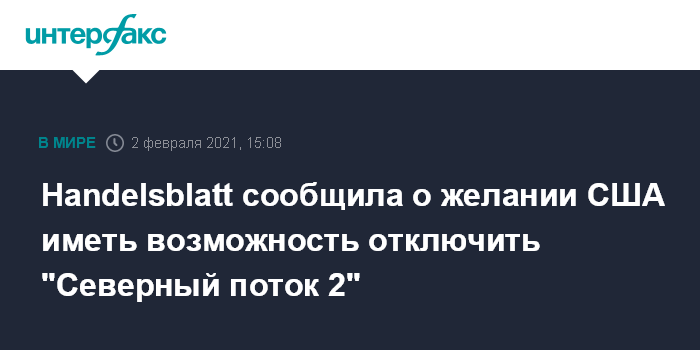 Москва. 2 февраля. INTERFAX.RU - США заинтересованы в идее снабдить газопровод "Северный поток 2" механизмом отключения на крайний случай, сообщает газета Handelsblatt со ссылкой на собственные источники.