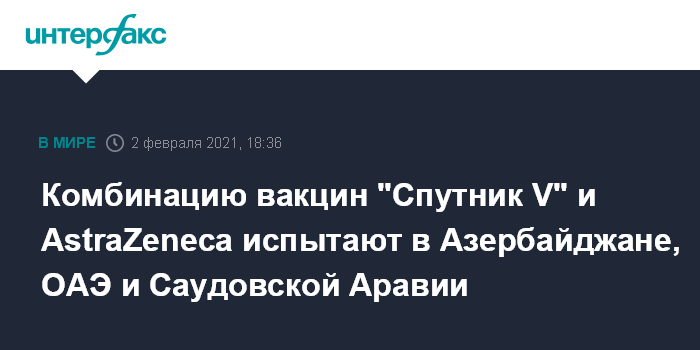 Москва. 2 февраля. INTERFAX.RU - Клинические испытания комбинации вакцин от COVID-19 "Спутник V" центра имени Гамалеи и AZD1222 ("Оксфордской вакцины") производства AstraZeneca в Объединенных Арабских Эмиратах и Азербайджане начнутся уже на следующей неделе, а затем и в Саудовской Аравии.
