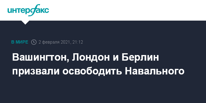 Москва. 2 февраля. INTERFAX.RU - Власти США, Великобритании и Германии призвали освободить российского оппозиционера Алексея Навального, которому суд в Москве заменил условный срок на 3,5 года колонии. Политик фактически проведет в колонии 2 года 8 месяцев, если решение о замене его условного наказания на реальное вступит в законную силу.