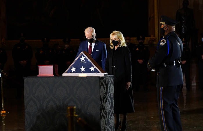 Байден и первая леди Джилл Байден прибыли в Капитолий около 22 часов. Останки полицейского были выставлены в ротонде здания Конгресса США.