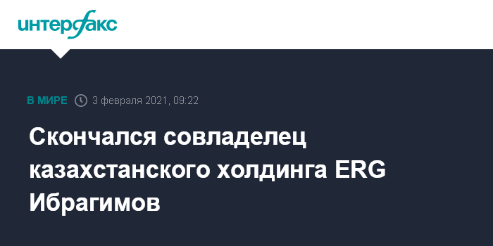 Москва. 3 февраля. INTERFAX.RU - Один из основателей и совладелец холдинга Eurasian Resources Group (ERG) Алиджан Ибрагимов скончался на 67 году жизни, говорится в сообщении ERG