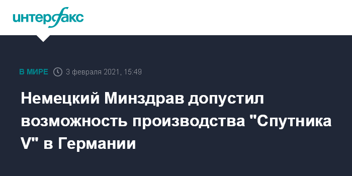 Москва. 3 февраля. INTERFAX.RU - Министр здравоохранения Германии Йенс Шпан в среду не стал отрицать возможность производства на немецкой территории российской вакцины "Спутник V" от коронавируса COVID-19, сообщает газета Die Zeit.