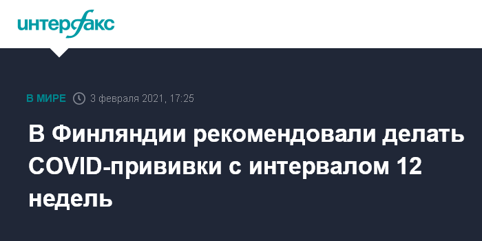 Москва. 3 февраля. INTERFAX.RU - Финская национальная экспертная группа по вакцине рекомендовала делать интервал в 12 недель между двумя дозами вакцины от коронавируса, сообщает телерадиокомпания Yle.