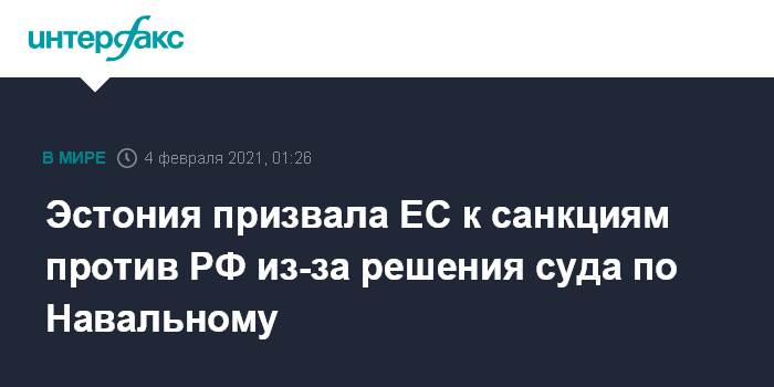 Москва. 4 февраля. INTERFAX.RU - Министр иностранных дел Эстонии Эва-Мария Лииметс (Eva-Maria Liimets) призвала Европейский союз наложить санкции против России в связи с решением суда о замене условного срока Алексея Навального по делу "Ив Роше" на реальный.