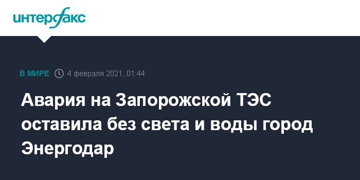Москва. 4 февраля. INTERFAX.RU - В городе Энергодаре Запорожской области Украины вечером 3 февраля на тепловой электростанции (ТЭС) произошла авария, в результате которой город остался без света и воды, сообщил депутат Энергодарского горсовета Анатолий Анохин.