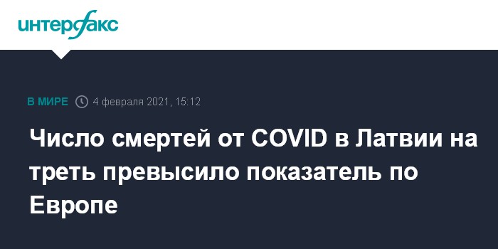 Число летальных исходов от коронавируса в Латвии сейчас на 32% выше, чем средний показатель по Европе, сообщает BNS. Кумулятивная 14-дневная смертность среди больных COVID-19 на 1 млн человек составляет в этой стране 136,4 случая, тогда как в Европе - 103,1. Коронавирус "обогнал" ДТП, травмы и самоубийства и стал третьей самой распространенной причиной смерти в Латвии.