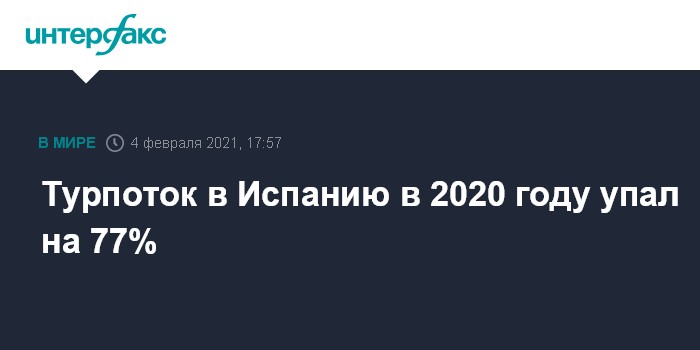 Москва. 4 февраля. INTERFAX.RU - Испанию в 2020 году посетило 19 млн иностранных туристов, что на 77,3% меньше, чем в 2019 году (83,5 млн), следует из данных Национального института статистики (INE) страны.