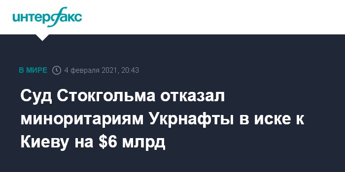 Москва. 4 февраля. INTERFAX.RU - Международный арбитражный суд Стокгольма отказал Игорю Коломойскому, Геннадию Боголюбову и Игорю Палице как владельцам 40,1% акций ПАО "Укрнафта" в удовлетворении их иска к Украине на сумму свыше $6 млрд, признав отсутствие своей юрисдикции, сообщил министр юстиции Украины Денис Малюська.