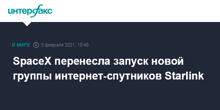 Москва. 5 февраля. INTERFAX.RU -Запуск тяжелой ракеты-носителя Falcon 9 с очередной партией из 60 мини-спутников для пополнения орбитальной группировки глобальной сети интернет-покрытия системы Starlink, планировавшийся в пятницу, перенесен на 7 февраля, сообщила компания-разработчик SpaceX.