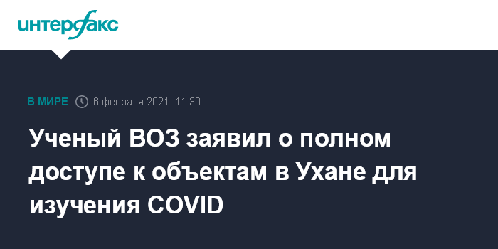 Москва. 6 февраля. INTERFAX.RU - Китай предоставил членам команды Всемирной организации здравоохранения (ВОЗ) полный доступ ко всем объектам и к людям в Ухане, который они запрашивали, сообщает в субботу Associated Press со ссылкой на заявление Питера Дашака - члена группы ученых, прибывших в КНР исследовать причины появления коронавируса COVID-19.