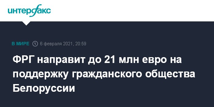 Москва. 6 февраля. INTERFAX.RU - Германия выделит на программу поддержки гражданского общества в Белоруссии до 21 млн евро, заявил глава МИД ФРГ Хайко Маас на онлайн-конференции "Солидарность с Белоруссией" в субботу.