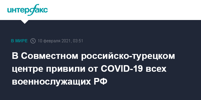 Москва. 10 февраля. INTERFAX.RU - Завершена вакцинация от коронавирусной инфекции российских военнослужащих Совместного российско-турецкого центра, развернутого на территории Азербайджана, сообщает Минобороны РФ.