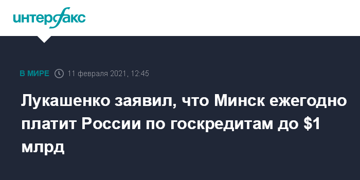 Москва. 11 февраля. INTERFAX.RU - Белоруссия ежегодно выплачивает России проценты по ранее выданным госкредитам в сумме около $1 млрд, причем ставка по кредитам выше общемировой, сообщил президент Белоруссии Александр Лукашенко.