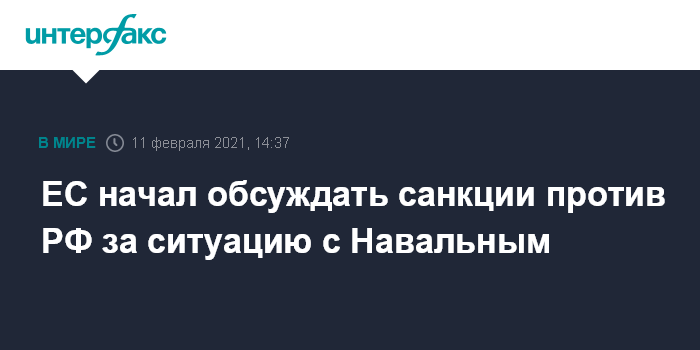 Москва. 11 февраля. INTERFAX.RU - В Евросоюзе приступили к процессу обсуждения возможных санкций против России из-за ситуации с оппозиционером Алексеем Навальным, сообщает Bloomberg со ссылкой на европейские источники.