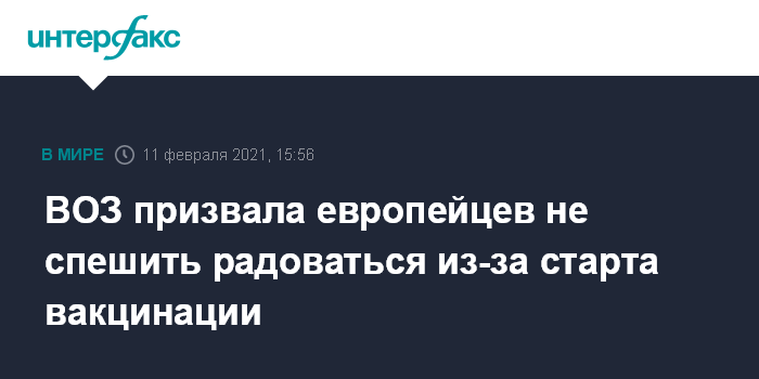 Москва. 11 февраля. INTERFAX.RU - Во Всемирной организации здравоохранения (ВОЗ) в четверг призвали жителей европейских стран не поддаваться ложному чувству безопасности в связи с началом кампаний по вакцинации против коронавируса COVID-19, передают европейские СМИ.
