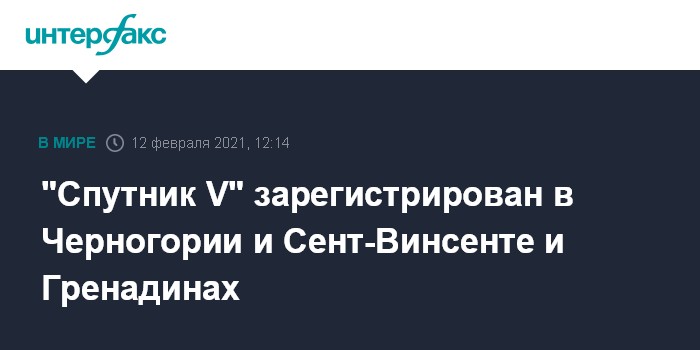 Москва. 12 февраля. INTERFAX.RU - Вакцина "Спутник V" зарегистрирована еще в двух странах - Черногории и стране Карибского бассейна - Сент-Винсент и Гренадины.