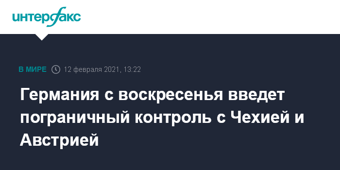 Москва. 12 февраля. INTERFAX.RU - Германия с 14 февраля вводит пограничный контроль с Чехией и Австрией из-за пандемии коронавируса, сообщил представитель немецкого МВД.