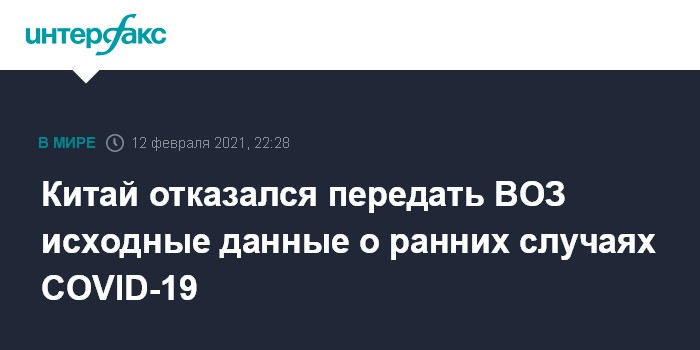 Москва. 12 февраля. INTERFAX.RU - Китай отказался предоставлять экспертам Всемирной организации здравоохранения (ВОЗ), работавшим в Ухане, первичную персонализированную информацию о ранних случаях заражения коронавирусом COVID-19, сообщает The Wall Street Journal со ссылкой на специалистов ВОЗ.