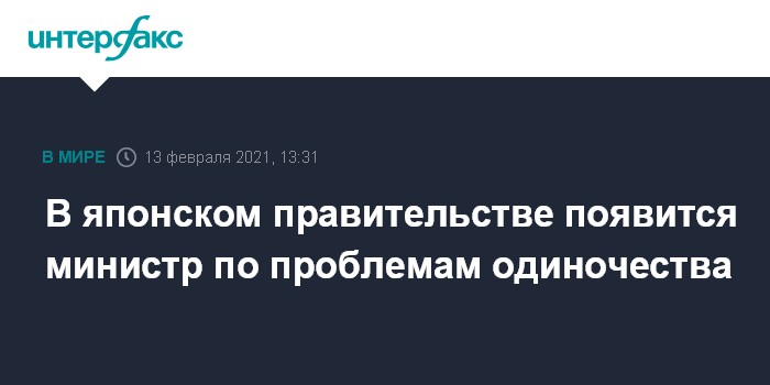 Москва. 13 февраля. INTERFAX.RU - Японский министр по делам восстановления жизнедеятельности регионов Тэцуси Сакамото по совместительству займет пост министра по проблемам одиночества. Такое решение принял премьер-министр Японии Йосихидэ Суга, сообщает Nikkei.