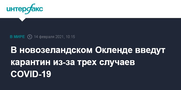 Москва. 14 февраля. INTERFAX.RU - Власти Новой Зеландии с 0:00 понедельника (14:00 по Москве воскресенья) на три дня установят режим изоляции в самом крупном городе страны Окленде в связи с обнаружением здесь трех случаев коронавируса COVID-19 неизвестного происхождения, сообщает агентство Associated Press.