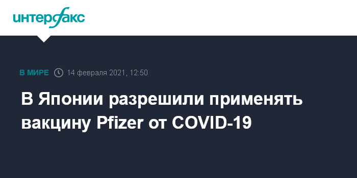 Москва. 14 февраля. INTERFAX.RU - Минздрав Японии в воскресенье выдал разрешение на применение в стране вакцины компании Pfizer от COVID-19, сообщает издание The Mainichi.