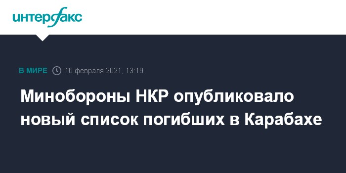 Москва. 16 февраля. INTERFAX.RU - Армия обороны непризнанной Нагорно-Карабахской республики (НКР) во вторник опубликовала новый список военнослужащих, погибших в боевых действиях в зоне карабахского конфликта осенью минувшего года.