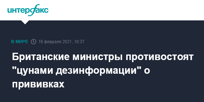 Москва. 16 февраля. INTERFAX.RU - Правительству Великобритании приходится бороться с "цунами дезинформации" о вакцинации от коронавируса, заявил Sky News министр по вакцинации Надхим Захави. Он добавил, что в правительстве есть специальный отдел по работе с интернет-платформами по блокировке фейков о вакцинах.