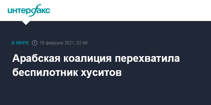 Москва. 18 февраля. INTERFAX.RU - Арабская коалиция перехватила и уничтожила беспилотник хуситов, запущенный в сторону саудовского города Хамис-Мушайт, сообщает телеканал Al-Arabiya.