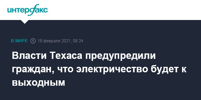 Москва. 18 февраля. INTERFAX.RU - Маловероятно, что энергоснабжение в американском Техасе, нарушенное в связи с экстремальными холодами, может быть восстановлено к выходным дням, сообщили власти штата.