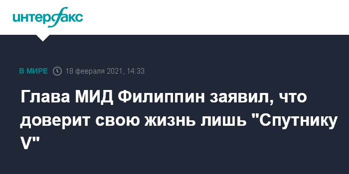 Москва. 18 февраля. INTERFAX.RU - Глава МИД Филиппин Теодоро Локсин заявил, что российская вакцина "Спутник V" от коронавируса COVID-19 является единственной, вызывающей у него доверие.