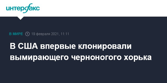Москва. 19 февраля. INTERFAX.RU - Американские ученые впервые клонировали представителя исчезающего вида - черноногого хорька, использовав для этого гены животного, которое умерло более 30 лет назад, сообщает в пятницу Associated Press.
