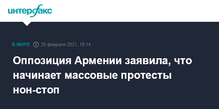 Москва. 20 февраля. INTERFAX.RU - Оппозиция Армении объявила о начале непрекращающихся акций протеста до тех пор, пока премьер республики Никол Пашинян не уйдет в отставку.