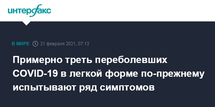 Москва. 21 февраля. INTERFAX.RU - Около 30% людей, которые перенесли коронавирус COVID-19 в легкой форме, спустя несколько месяцев после завершения лечения по-прежнему страдают от ряда симптомов, сообщает телеканал CNN со ссылкой на исследование Университета Вашингтона.