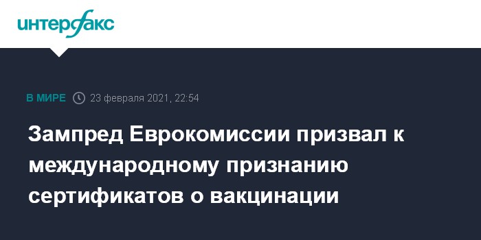 Москва. 23 февраля. INTERFAX.RU - Государства-члены ЕС согласны, что сертификаты о вакцинации необходимы хотя бы в медицинских целях, и они могли бы быть инструментом регистрации вакцинированных людей для оценки кампаний вакцинации, заявил заместитель председателя Еврокомиссии (ЕК) Марош Шефчович.
