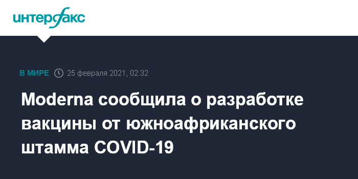 Москва. 25 февраля. INTERFAX.RU - Компания Moderna разработала обновленную версию своей вакцины против COVID-19, направленную на борьбу с южноафриканским вариантом коронавируса, и отправила в Национальный институт здравоохранения США для клинического испытания.