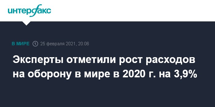 Москва. 25 февраля. INTERFAX.RU - Расходы на оборону в мире по сравнению с 2019 годом возросли на 3,9% за 2020 год, несмотря на пандемию коронавируса COVID-19 и экономические трудности, говорится в обнародованном в четверг обзоре Международного института стратегических исследований (IISS) - аналитического центра со штаб-квартирой в Лондоне.