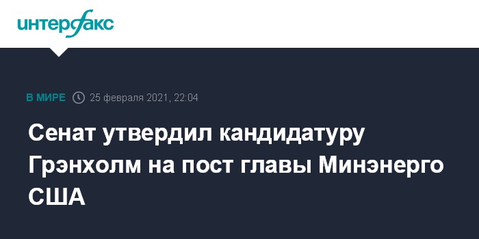 Москва. 25 февраля. INTERFAX.RU - Сенат США утвердил кандидатуру Дженнифер Грэнхолм на пост главы министерства энергетики страны, сообщает The Hill.