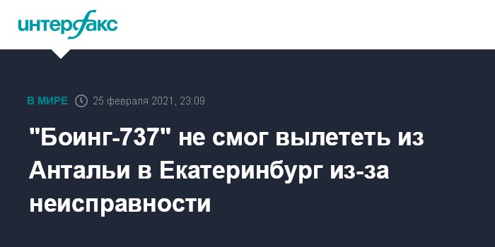 Москва. 25 февраля. INTERFAX.RU - Самолет "Боинг-737", выполняющий чартерный рейс из Антальи в Екатеринбург, не смог своевременно вылететь из-за неисправности, пассажиры пожаловались на запах гари.
