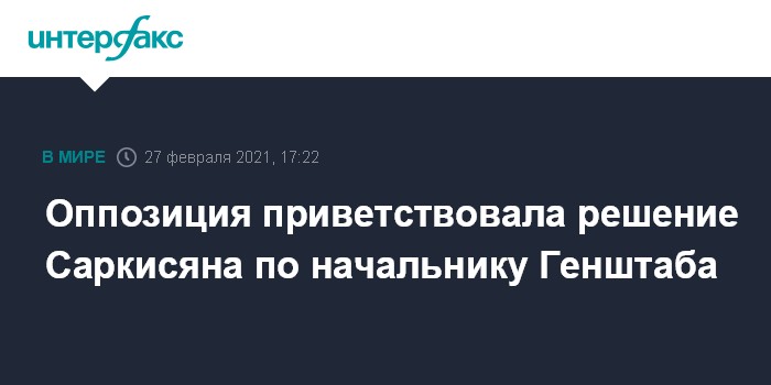 Москва. 27 февраля. INTERFAX.RU - Оппозиция Армении приветствовала решение президента страны Армена Саркисяна, отказавшегося увольнять по требованию премьера Никола Пашиняна начальника Главного штаба ВС Оника Гаспаряна.