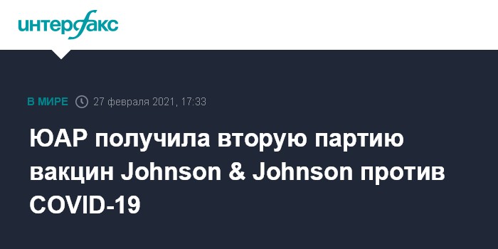 Москва. 27 февраля. INTERFAX.RU - В ЮАР в субботу подтвердили получение второй партии доз вакцины против коронавируса COVID-19 компании Johnson & Johnson, которая эффективна против нового штамма, заявил министр здравоохранения страны Звели Мкхизе.