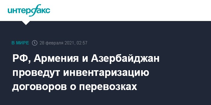 Москва. 28 февраля. INTERFAX.RU - Компетентные органы России, Армении и Азербайджана проведут инвентаризацию международных договоров, заключенных в рамках СНГ и с третьими странами, по вопросам осуществления перевозок в регионе и обеспечения соответствующего контроля за ними.