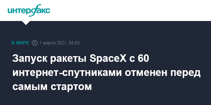 Москва. 1 марта. INTERFAX.RU - Запуск тяжелой ракеты-носителя Falcon 9 с очередной партией из 60 мини-спутников для пополнения орбитальной группировки глобальной сети интернет-покрытия системы Starlink, планировавшийся в понедельник, отменен за 1 минуту 24 секунды до старта, сообщила компания-разработчик SpaceX.