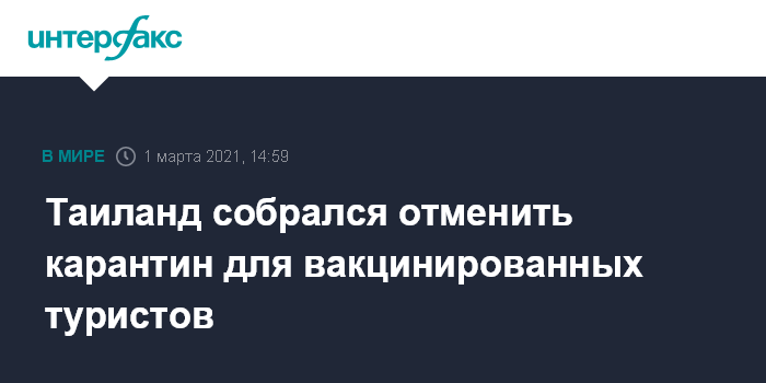 Москва. 1 марта. INTERFAX.RU - Таиланд готов отменить карантин для вакцинированных туристов, это поможет возродить туристический сектор страны, сообщает газета Bangkok Post.