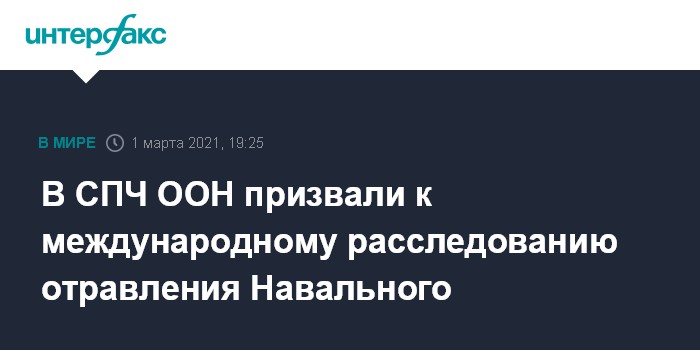 Москва. 1 марта. INTERFAX.RU - В Совете по правам человека ООН призвали срочно провести международное расследование отравления Алексея Навального с учетом "неудовлетворительной реакции местных органов власти, применения запрещенного химоружия и очевидной картины попыток целенаправленного убийства".