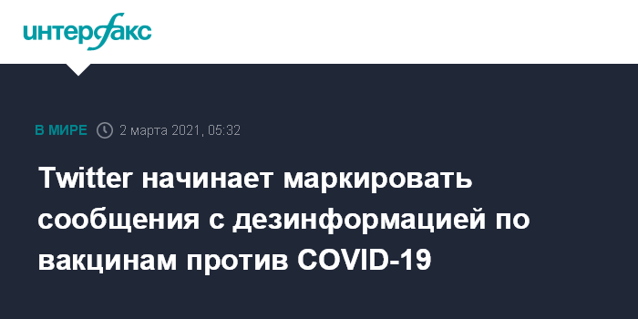 Москва. 2 марта. INTERFAX.RU - Компания Twitter сообщила, что начнет маркировать твиты, содержащие вводящую в заблуждение информацию о вакцинах против COVID-19.