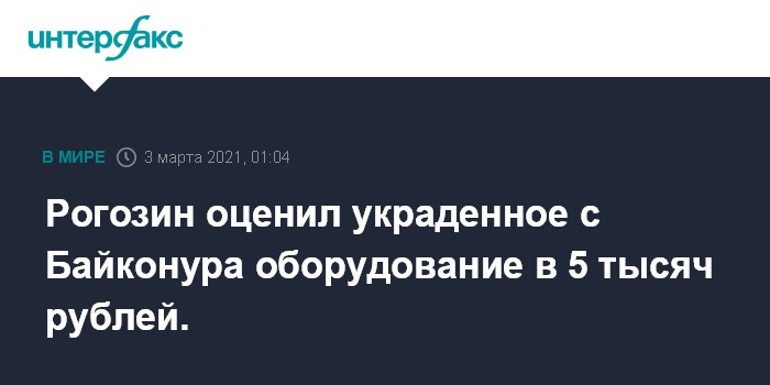 Москва. 3 марта. INTERFAX.RU - Оборудование, украденное с законсервированной площадки космодрома "Байконур", не представляет ценности, заявил глава "Роскосмоса" Дмитрий Рогозин.