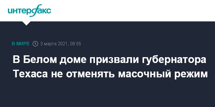 Советник по вопросам с COVID-19 в Белом доме Энди Славитт призвал губернатора Техаса передумать и не отменять масочный режим и другие ограничения. Он сказал СNN, что в администрации США это считают ошибкой и что отказываться от масок еще слишком рано.