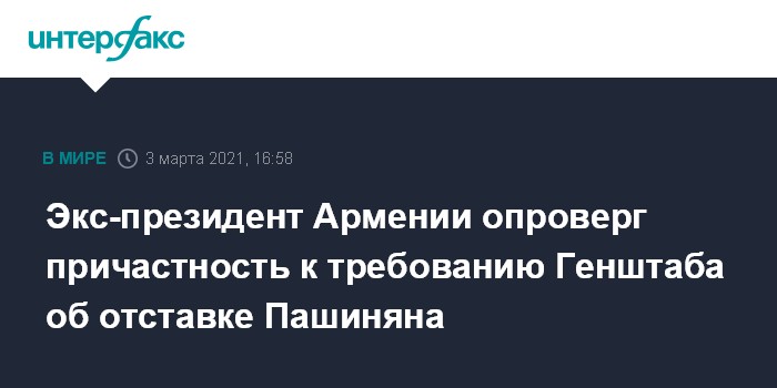 Москва. 3 марта. INTERFAX.RU - Бывший президент Армении Серж Саргсян опроверг заявление премьер-министра республики Никола Пашиняна о том, что руководство Главного штаба ВС потребовало отставки главы правительство под его влиянием.