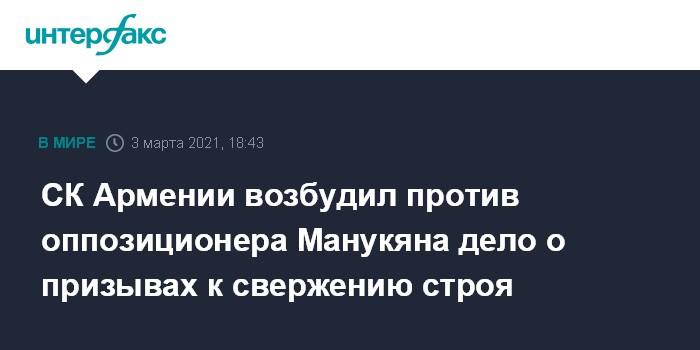 20 февраля на митинге оппозиции Манукян призвал своих сторонников "быть готовыми к восстанию", если премьер Армении Никол Пашинян не уйдет в отставку под давлением мирных демонстраций. "Надо быть готовыми с молниеносной быстротой путем восстания захватить власть. Необходима решительность", - заявил тогда оппозиционный лидер.