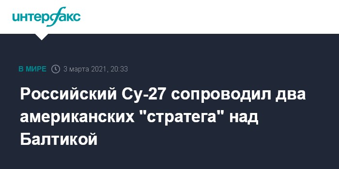 Москва. 3 марта. INTERFAX.RU - Российский истребитель Су-27 в среду был поднят на перехват двух стратегических бомбардировщиков B-1B над акваторией Балтийского моря, сообщили в Национальном центре управления обороной РФ.